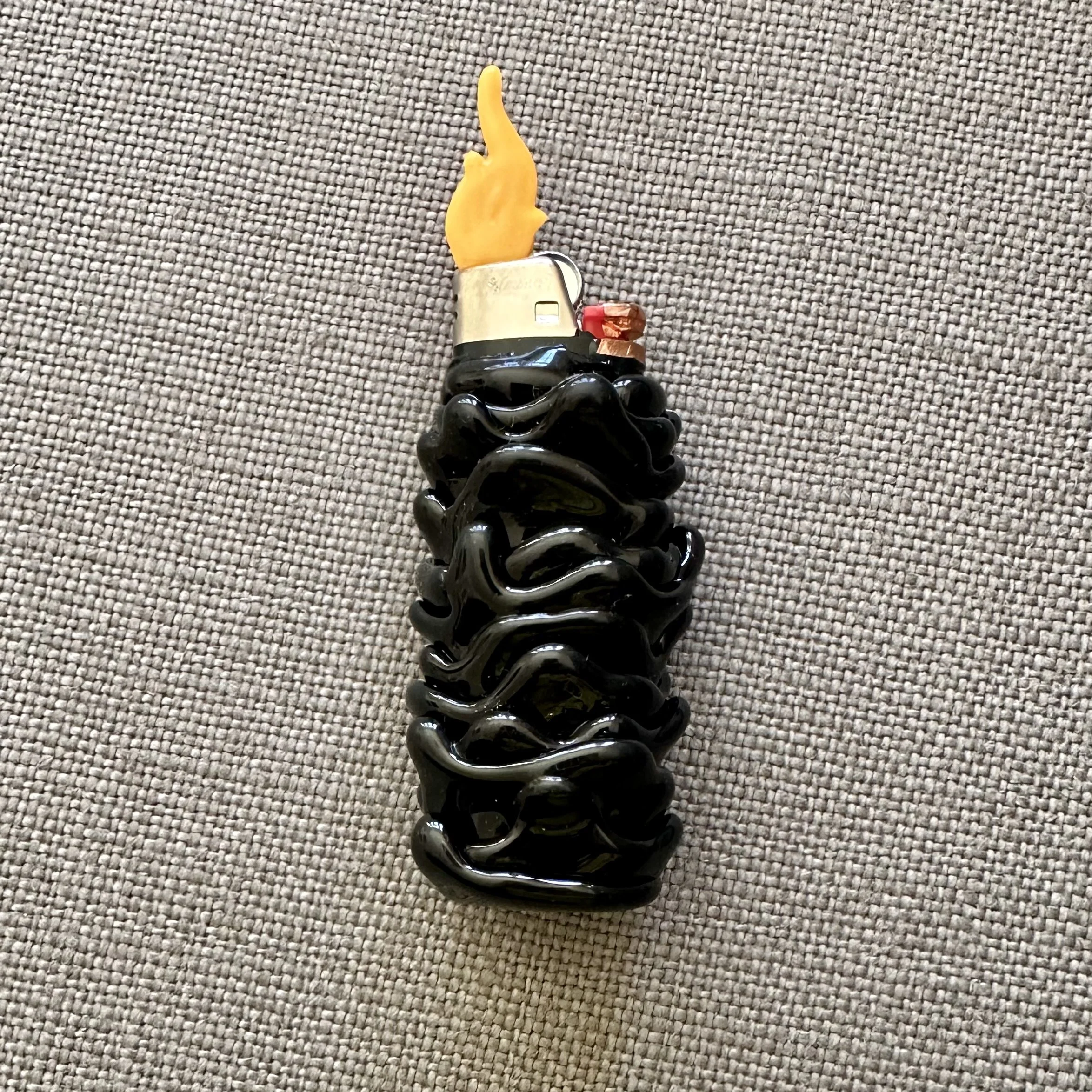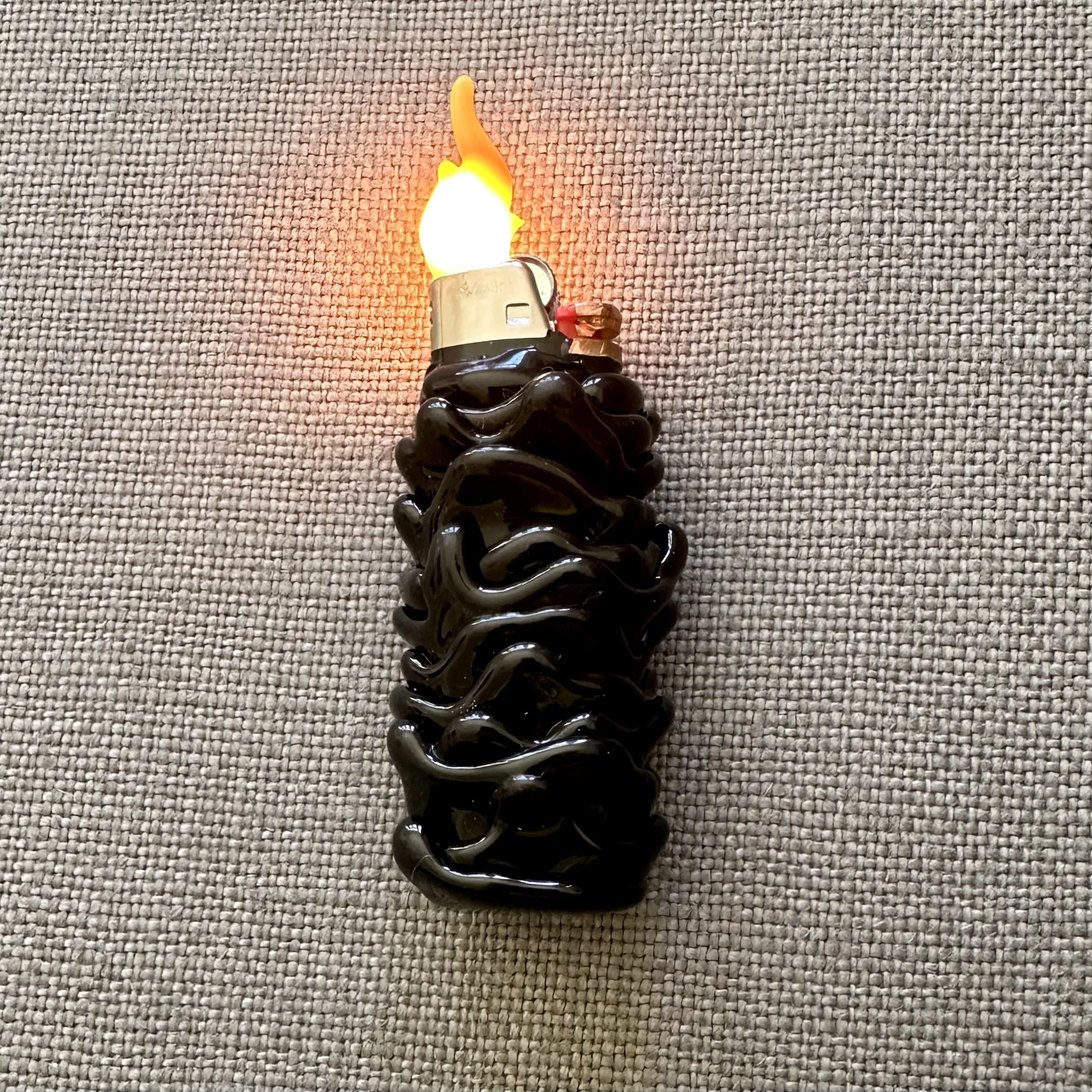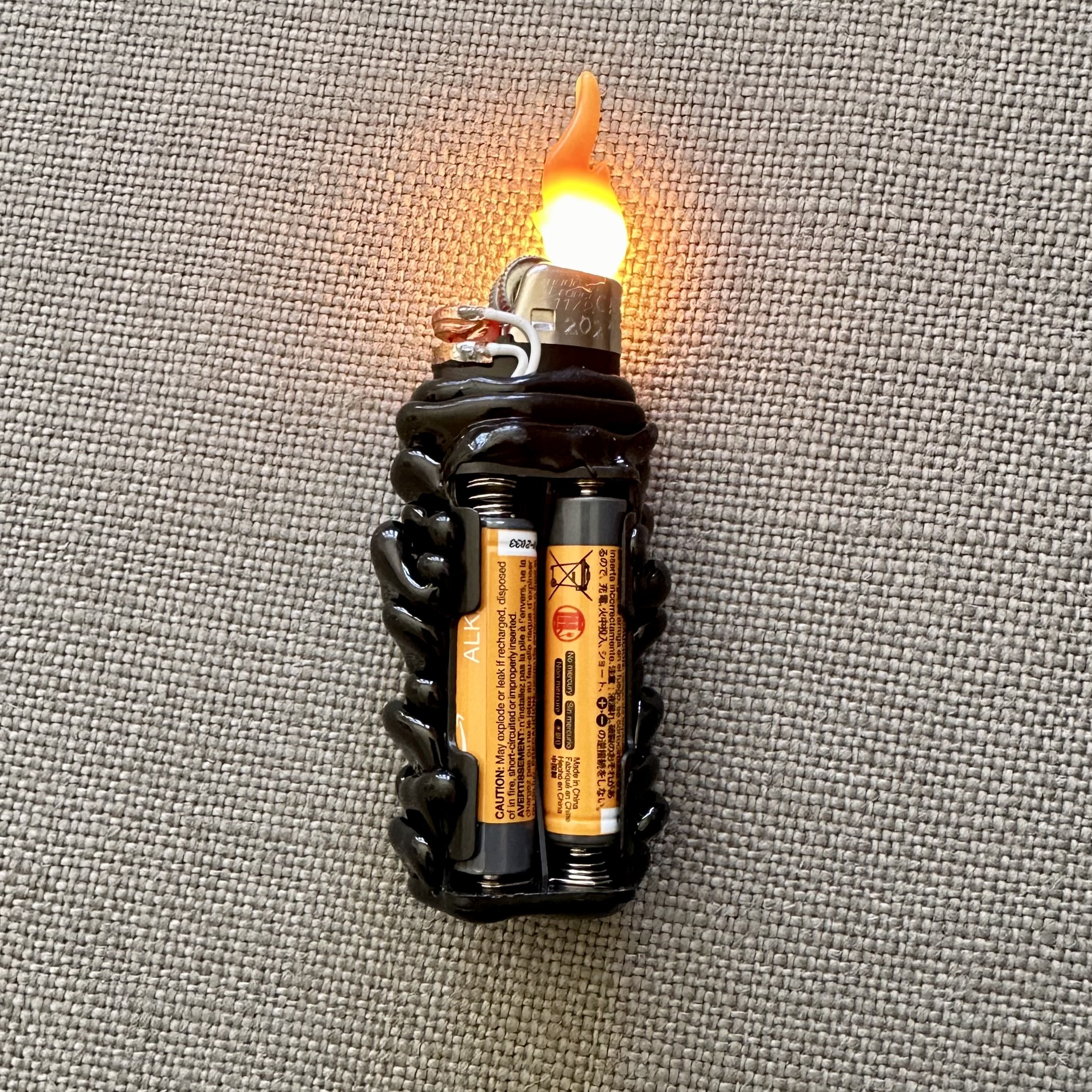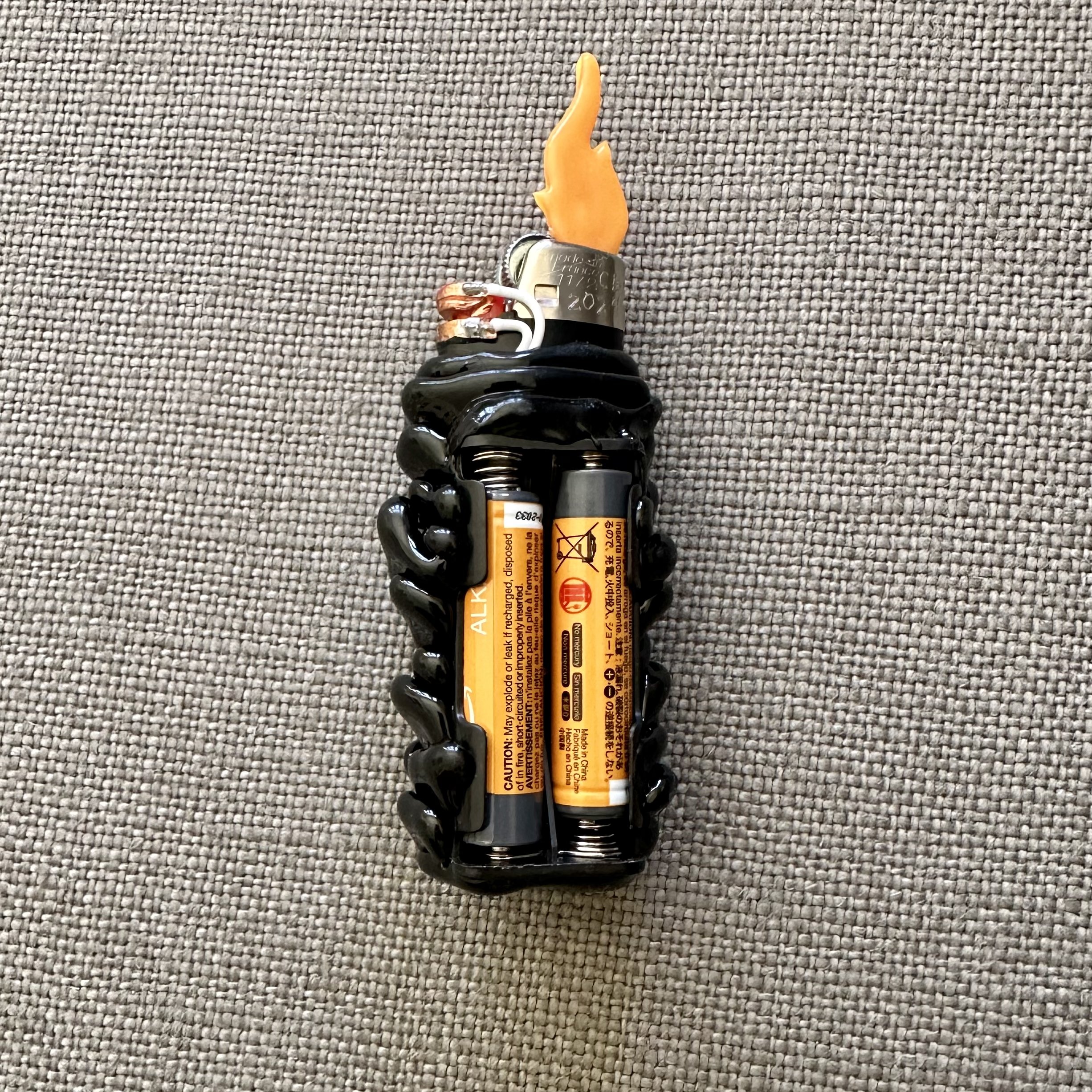 A collaboration Between Chris Beeston and T.B.D. Studio, the Hot Mess Bic Flashlight combines Beeston’s passion for creating adhoc plastic lamps with Tanner Bowman’s Hot Mess crafting technique. Beeston empties a BIC lighter and retrofits it with an AAA battery compartment and a flickering LED flame, which is operated using the fuel button as a switch. Tanner then reupholsters the flashlight with a drippy layer of pigmented hot glue to give each lighter a one of a kind finish. Comes with two rechargeable AAA batteries. Handle with care.