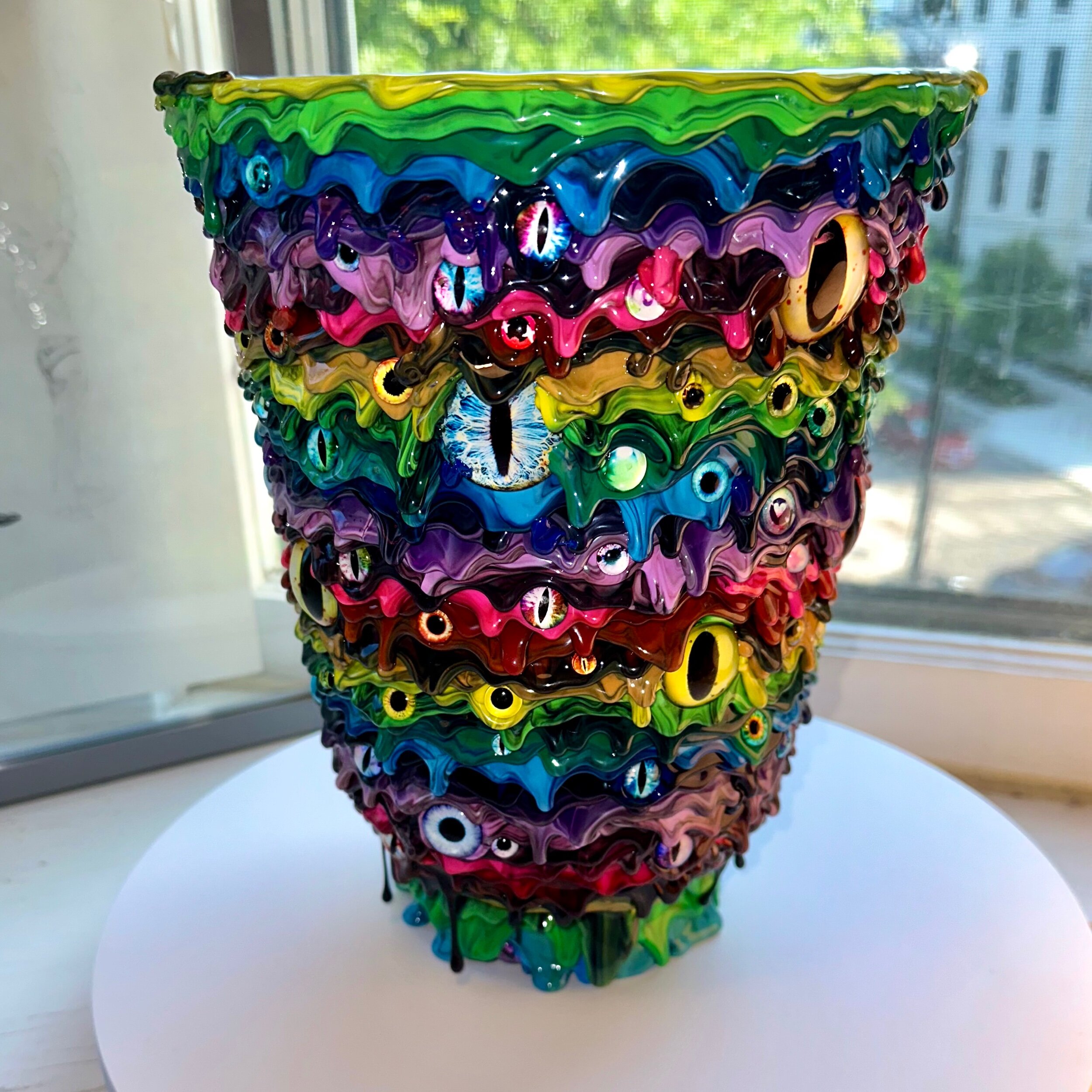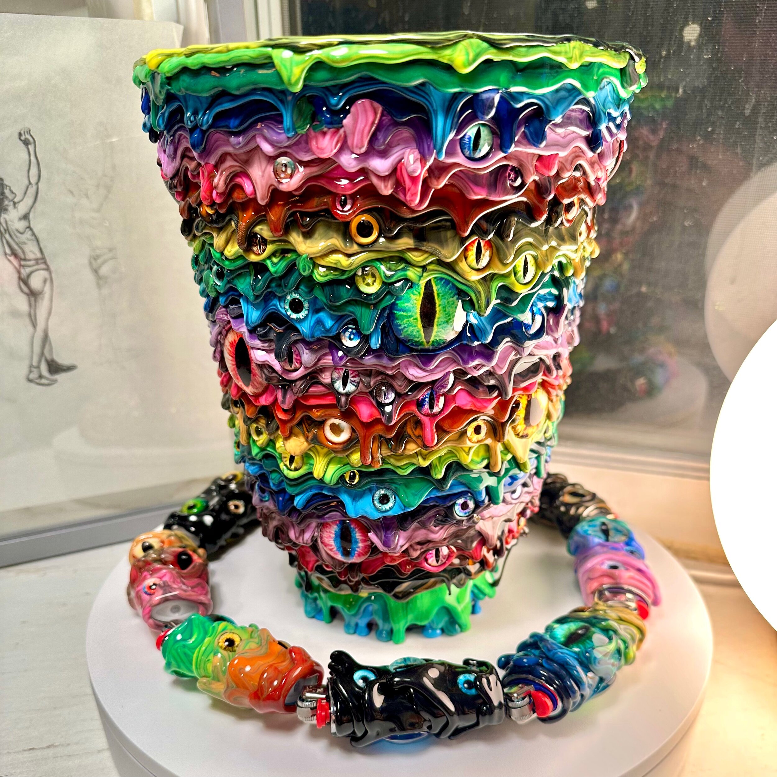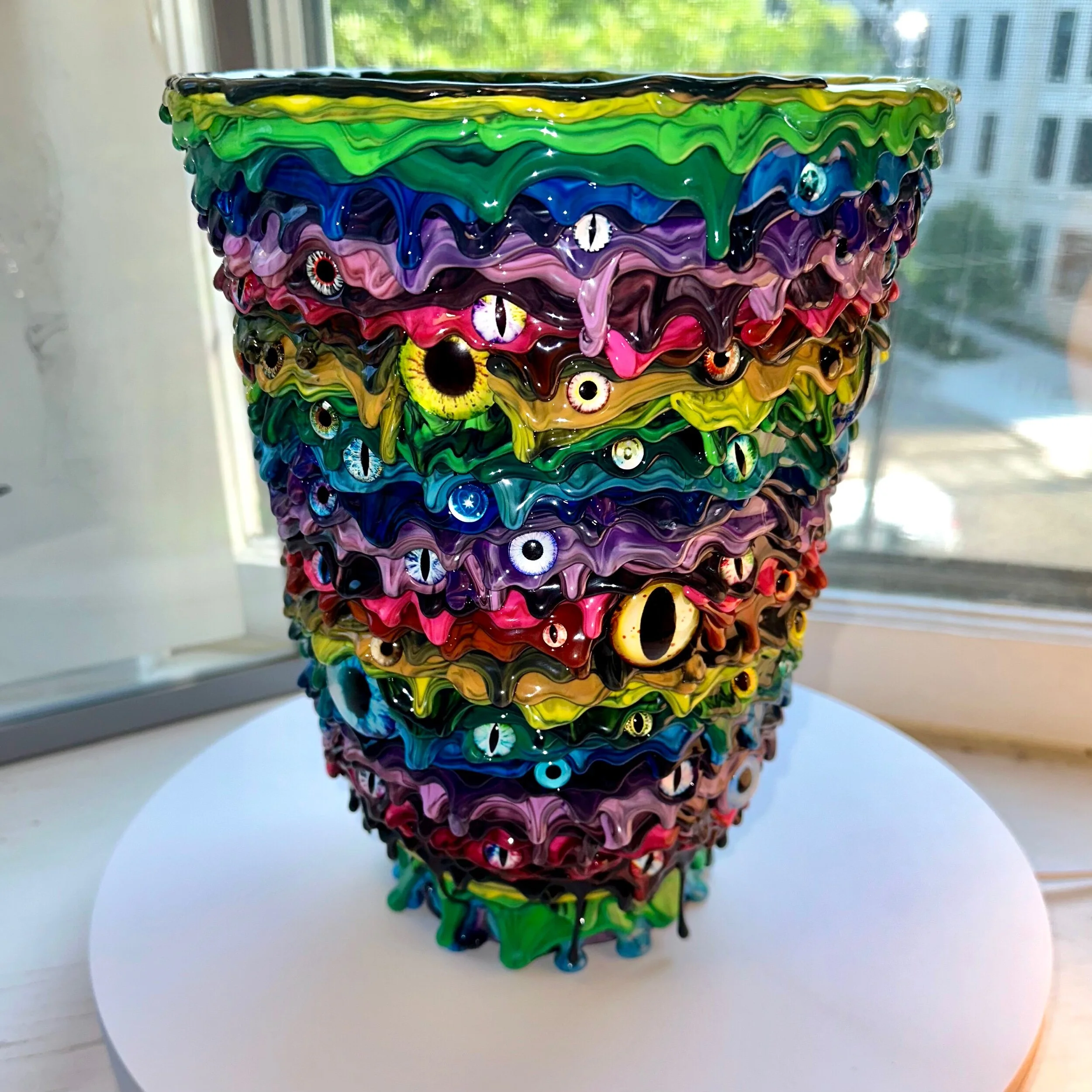 This one of a kind jelly eye black rainbow vessel watches over your home and protects you from bad vibes! Made with pigmented hot glue and resin charms. This vessel is also made on glass, so it is very sturdy and watertight. Great for holding flowers or for simply looking beautiful in your home.