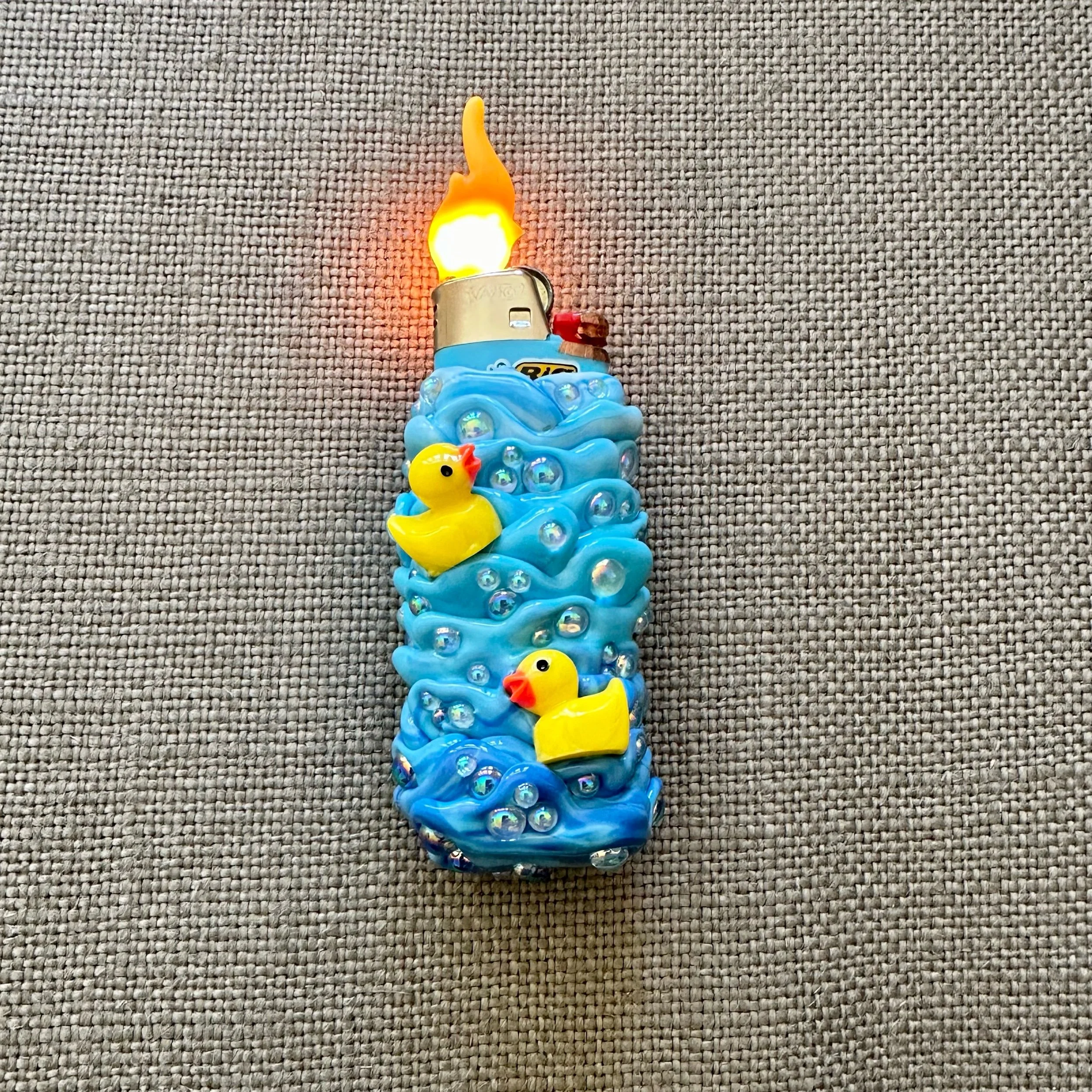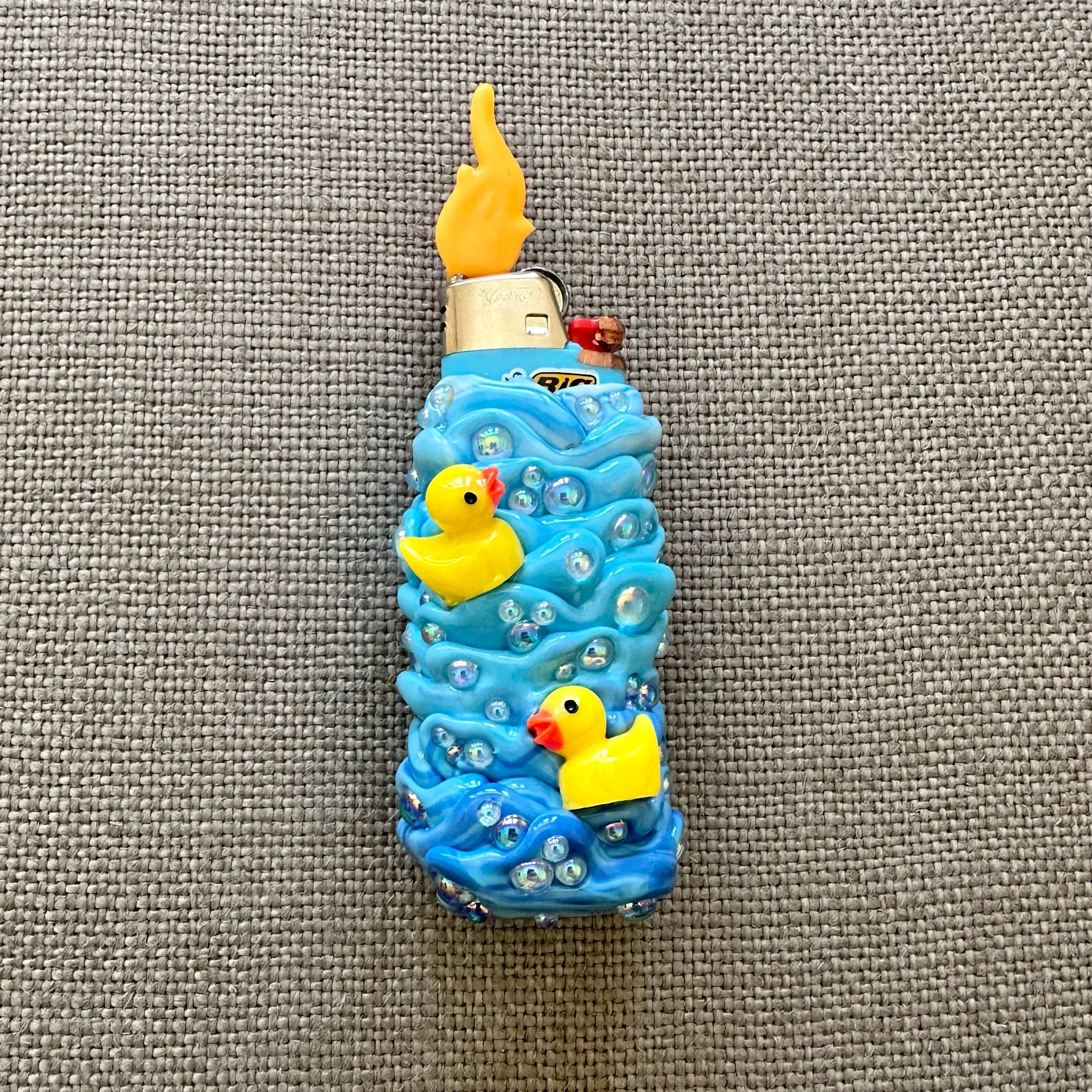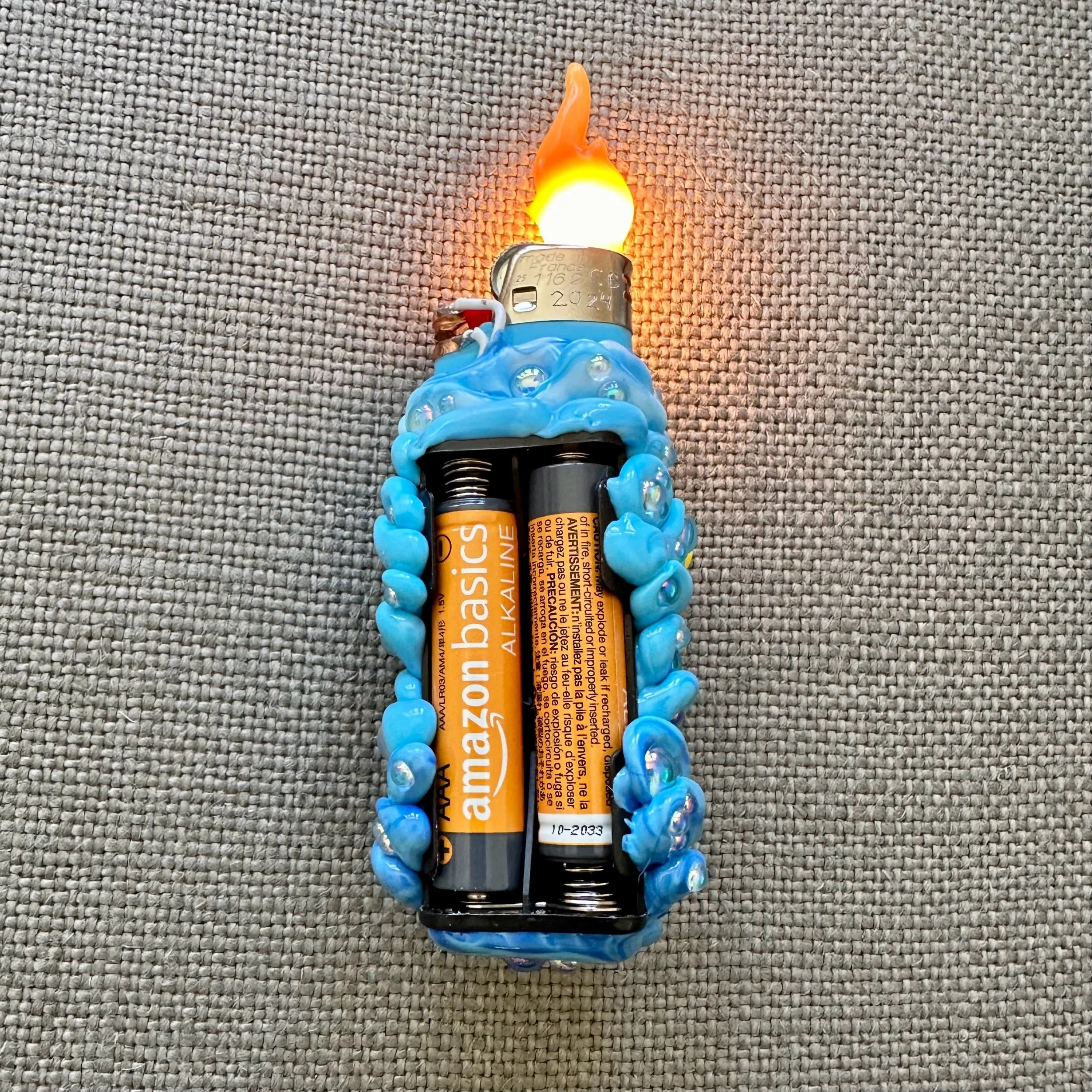 A collaboration Between Chris Beeston and T.B.D. Studio, the Hot Mess Bic Flashlight combines Beeston’s passion for creating adhoc plastic lamps with Tanner Bowman’s Hot Mess crafting technique. Beeston empties a BIC lighter and retrofits it with an AAA battery compartment and a flickering LED flame, which is operated using the fuel button as a switch. Tanner then reupholsters the flashlight with a drippy layer of pigmented hot glue to give each lighter a one of a kind finish. Comes with two rechargeable AAA batteries. Handle with care.